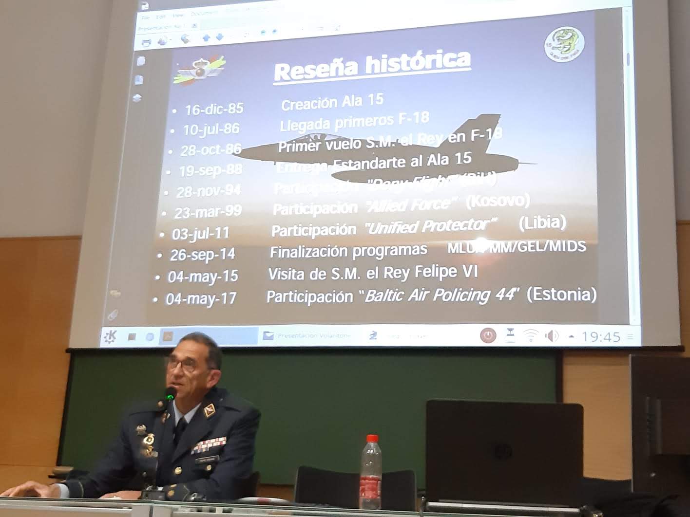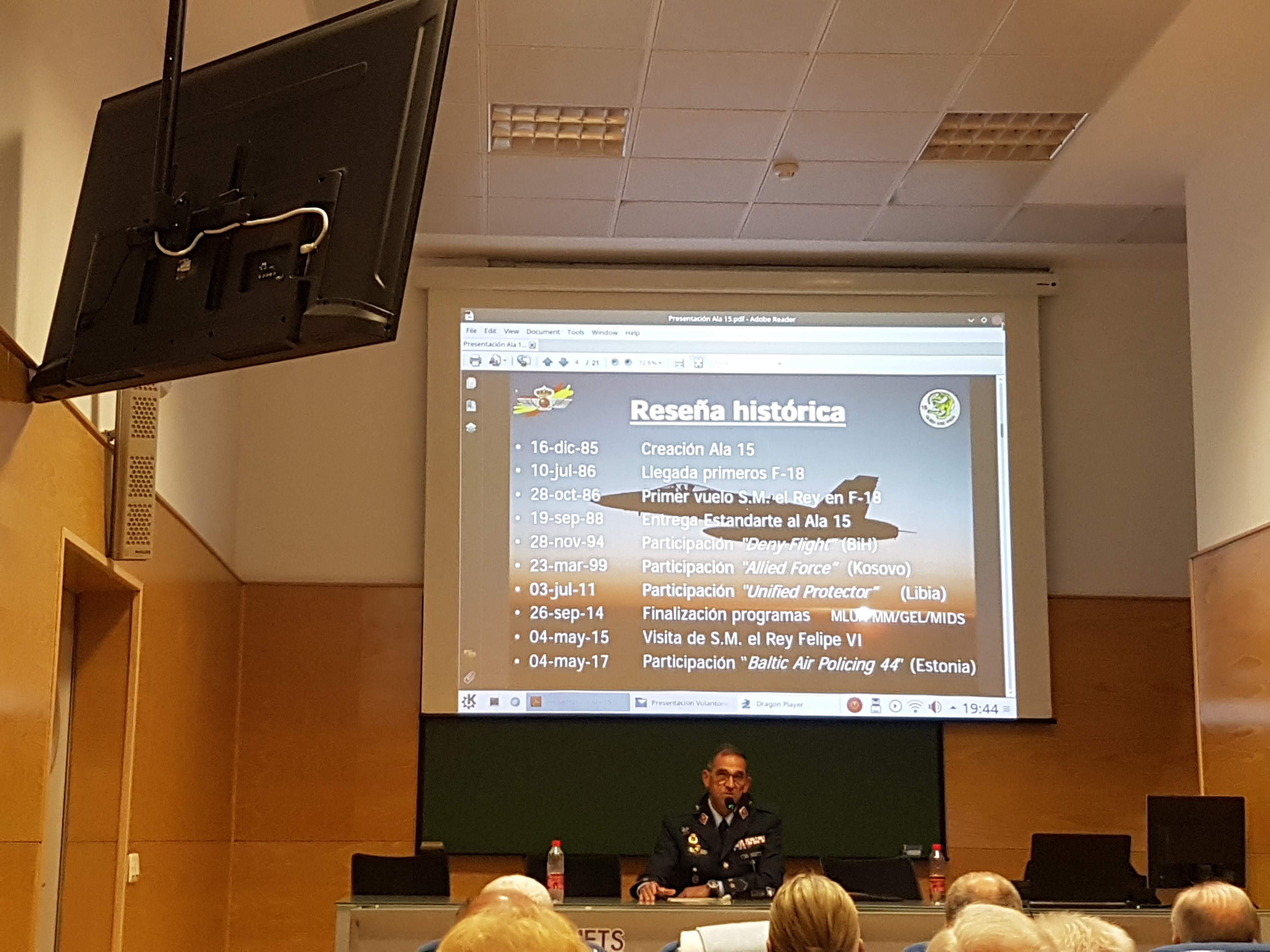 En pocas ocasiones tenemos la oportunidad de compartir impresiones con un piloto de caza, y verdaderamente ha sido muy interesante saber como vive la persona que vuela en estos aparatos, sus sensaciones y experiencias sobre las múltiples misiones a las que ha asistido. Nos ha hablado sobre la organización del ALA 15 en la Base Aérea de Zaragoza, y de como se vigila el espacio aéreo español, ademas de detalles sobre el funcionamiento del F18.